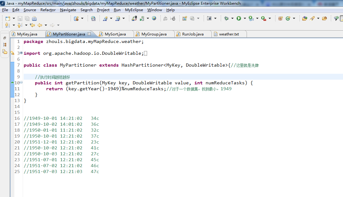 package zhouls.bigdata.myMapReduce.weather; import org.apache.hadoop.io.DoubleWritable; import org.apache.hadoop.io.NullWritable; import org.apache.hadoop.mapreduce.lib.partition.HashPartitioner; public class MyPartitioner extends HashPartitioner<MyKey, DoubleWritable>{//这里就是洗牌 //执行时间越短越好 public int getPartition(MyKey key, DoubleWritable value, int numReduceTasks) { return (key.getYear()-1949)%numReduceTasks;//对于一个数据集,找到最小,1949 } } //1949-10-01 14:21:02 34c //1949-10-02 14:01:02 36c //1950-01-01 11:21:02 32c //1950-10-01 12:21:02 37c //1951-12-01 12:21:02 23c //1950-10-02 12:21:02 41c //1950-10-03 12:21:02 27c //1951-07-01 12:21:02 45c //1951-07-02 12:21:02 46c //1951-07-03 12:21:03 47c