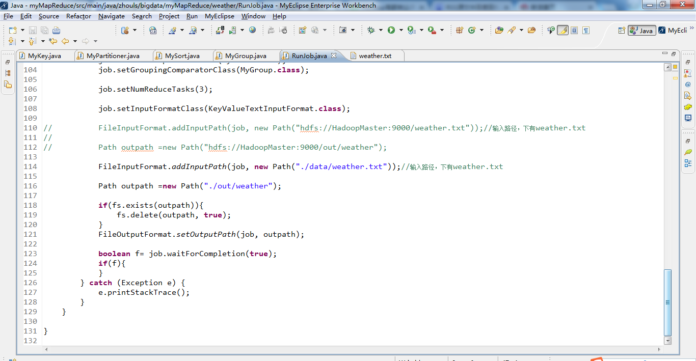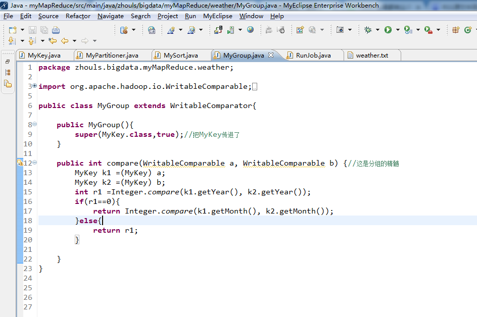 package zhouls.bigdata.myMapReduce.weather; import org.apache.hadoop.io.WritableComparable; import org.apache.hadoop.io.WritableComparator; public class MyGroup extends WritableComparator{ public MyGroup(){ super(MyKey.class,true);//把MyKey传进了 } public int compare(WritableComparable a, WritableComparable b) {//这是分组的精髓 MyKey k1 =(MyKey) a; MyKey k2 =(MyKey) b; int r1 =Integer.compare(k1.getYear(), k2.getYear()); if(r1==0){ return Integer.compare(k1.getMonth(), k2.getMonth()); }else{ return r1; } } }