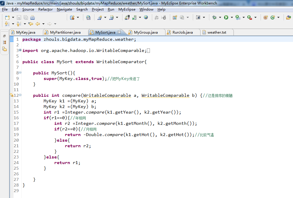 package zhouls.bigdata.myMapReduce.weather; import org.apache.hadoop.io.WritableComparable; import org.apache.hadoop.io.WritableComparator; public class MySort extends WritableComparator{ public MySort(){ super(MyKey.class,true);//把MyKey传进了 } public int compare(WritableComparable a, WritableComparable b) {//这是排序的精髓 MyKey k1 =(MyKey) a; MyKey k2 =(MyKey) b; int r1 =Integer.compare(k1.getYear(), k2.getYear()); if(r1==0){//年相同 int r2 =Integer.compare(k1.getMonth(), k2.getMonth()); if(r2==0){//月相同 return -Double.compare(k1.getHot(), k2.getHot());//比较气温 }else{ return r2; } }else{ return r1; } } }