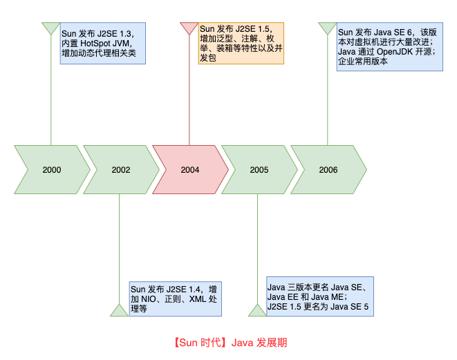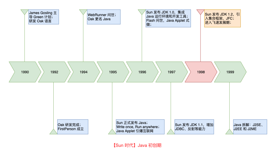 JDK 1.2 影响深远,Java 发生了很多革命性的变化,并且它的很多能力和规范沿用至今。至此,Sun 时代 Java 的初创期结束,进入了飞速发展的阶段。