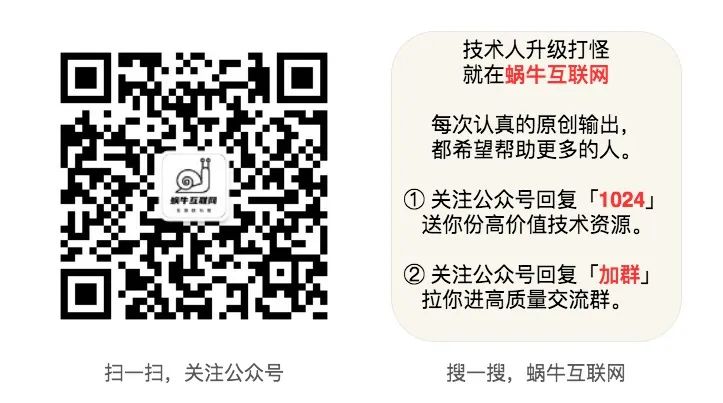 我是蜗牛,大厂程序员,专注技术原创和个人成长,正在互联网上摸爬滚打。欢迎关注我,和蜗牛一起成长,我们一起牛~下期见!