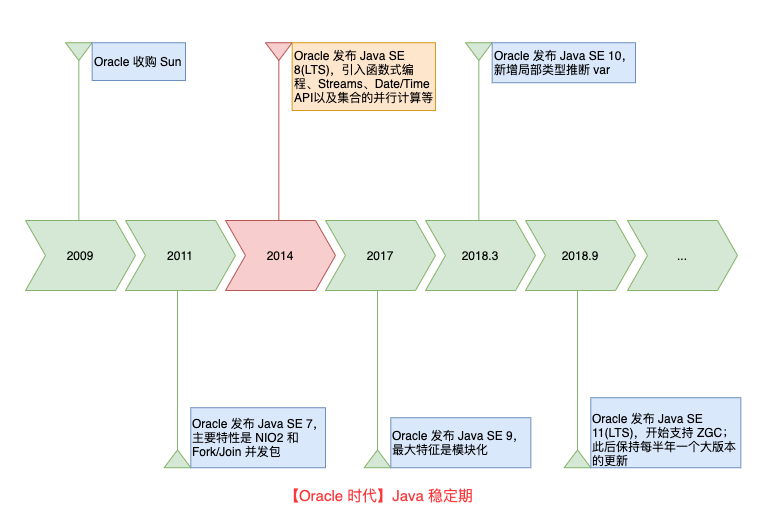 2009 年,Oracle 收购 Sun,Java 由 Oracle 继续维护。Java 的 Sun 时代终结,正式进入 Oracle 时代。