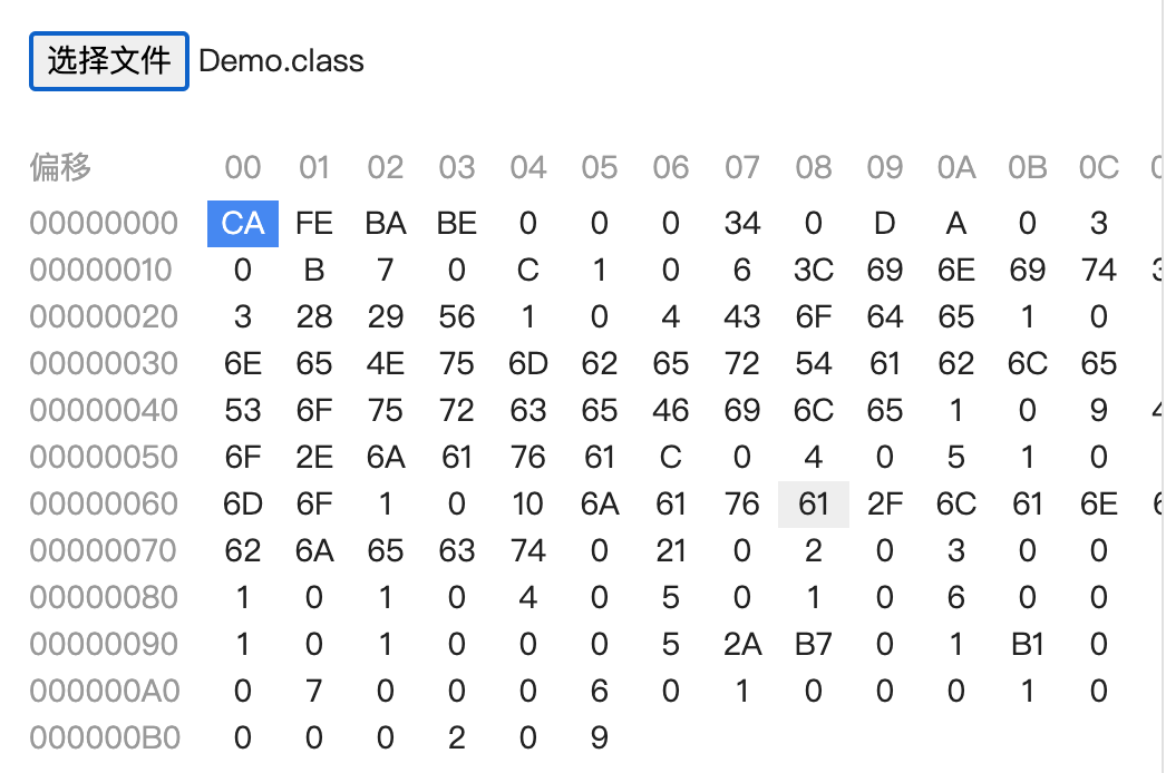 以下是我将 Demo.java 文件编译成 Demo.class 文件后,用网站工具看到的内容,感兴趣的同学可以亲自试下。
