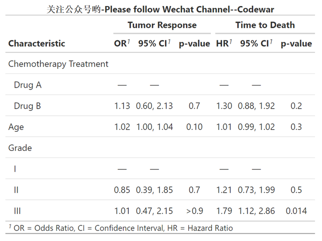 ) %>% modify_caption("**关注公众号哟-Please follow Wechat Channel--Codewar**")