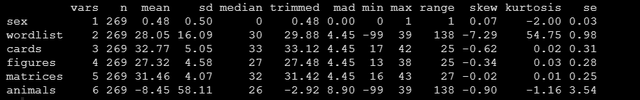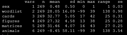 方法1感觉还是有点呆哈,给大家介绍方法2:我们还可以直接用psych包中的describe函数也可以得到连续变量常用的描述统计量,比如运行下面的代码: