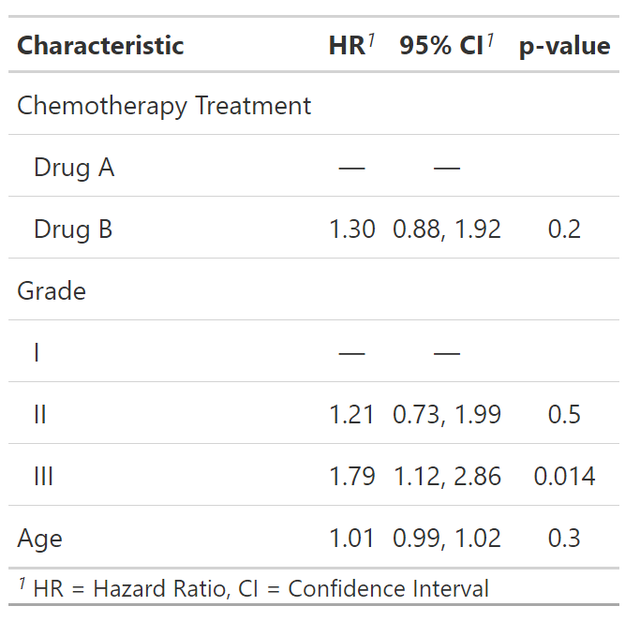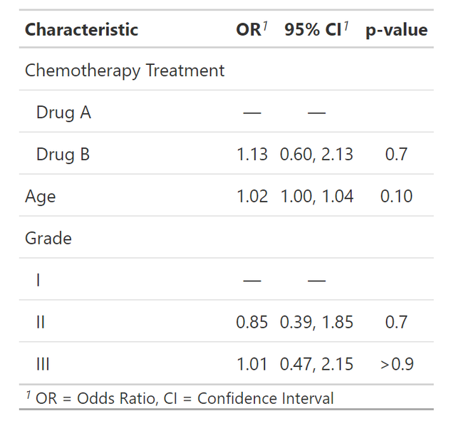 可以看到,代码基本就1行,add_p是添加分组比较的p值(按需使用),modify_caption是更改表的标题,运行上面的代码,即可得到又一张出版级的表格如下(内容和图3也是一样的):