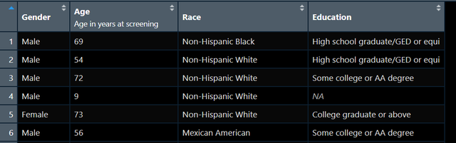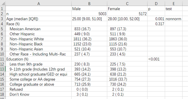 可以看到,sex变量是用频数百分比进行描述的,其余的连续变量都是以均值标准差呈现的。