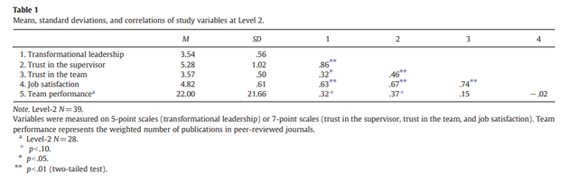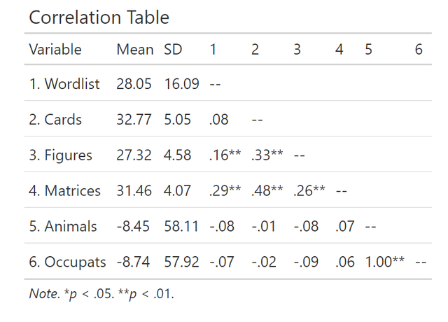 描述统计做完了之后我们有可能会需要做一下各个变量间的两两相关,期刊中常见的比较标准的相关结果表示方法如下,变量均值和标准差占两列,然后相关矩阵放后面: