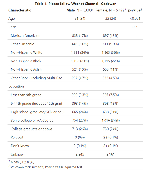 ) %>% add_p() %>% modify_caption("**Table 1. Please follow Wechat Channel--Codewar**")