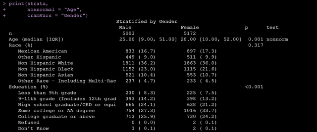 上面的代码中,strata参数设置分组变量,factorVars指定变量类型为因子,vars参数指定我们要进行统计描述的变量,运行后出来的结果如下: