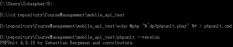 phpunit.cmd所在文件夹,运行phpunit --version。得到:PHPUnit 4.8.18 by Sebastian Bergmann and contributors.