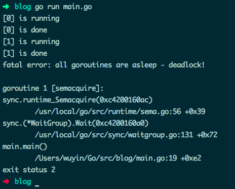 // www.topgoer.com go语言中文文档// 等待所有 goroutine 执行完毕// 进入死锁func main() {var wg sync.WaitGroupdone := make(chan struct{})workerCount := 2for i := 0; i < workerCount; i++ {wg.Add(1)go doIt(i, done, wg)}close(done)wg.Wait()fmt.Println("all done!")}func doIt(workerID int, done <-chan struct{}, wg sync.WaitGroup) {fmt.Printf("[%v] is running\n", workerID)defer wg.Done()<-donefmt.Printf("[%v] is done\n", workerID)}