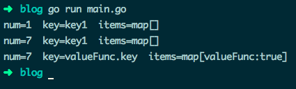 type data struct {num intkey *stringitems map[string]bool}func (this *data) pointerFunc() {this.num = 7}func (this data) valueFunc() {this.num = 8*this.key = "valueFunc.key"this.items["valueFunc"] = true}func main() {key := "key1"d := data{1, &key, make(map[string]bool)}fmt.Printf("num=%v key=%v items=%v\n", d.num, *d.key, d.items)d.pointerFunc() // 修改 num 的值为 7fmt.Printf("num=%v key=%v items=%v\n", d.num, *d.key, d.items)d.valueFunc() // 修改 key 和 items 的值fmt.Printf("num=%v key=%v items=%v\n", d.num, *d.key, d.items)}