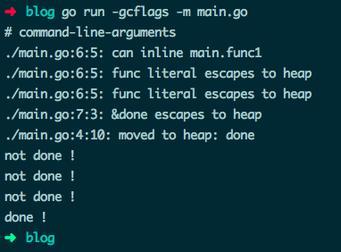 func main() {done := falsego func() {done = true}()for !done {runtime.Gosched()}println("done !")}最后