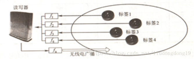 从读写器到多个电子标签的工作方式,读写器发送的信号同时被多个标签接收。