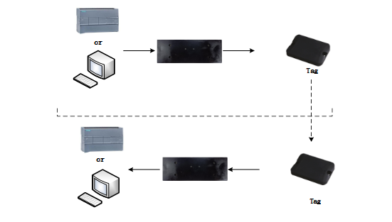 PC或者PLC终端发送命令到读写器,读写器处理后从卡片中读取数据或者写数据到标签中,读卡器读取到标签数据或者写完成数据后再将信息发送到PC或者PLC终端。