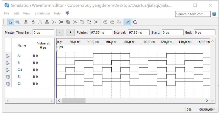 由图五的波形图所知,上图所画原理图正确,且符合全加器的真值表。
