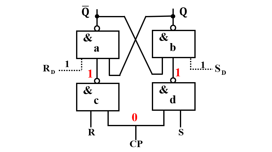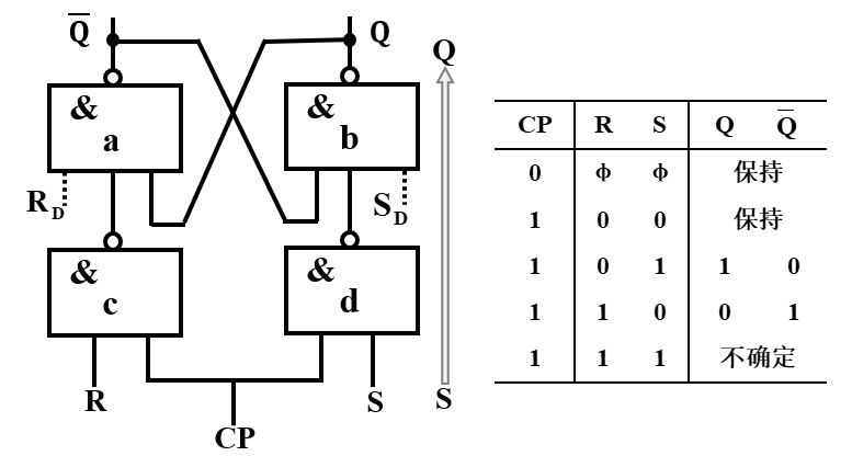 - 当 CP=0 时,无论R、S取何种值组合,输出端均保持原状态;