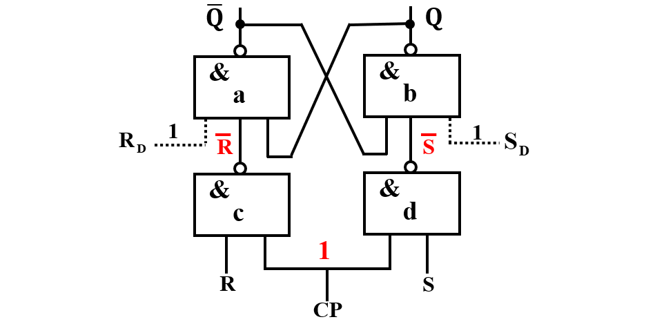 - 只有当 CP=1 时,将 c门 和 d门 打开,控制端R、S的取值组合反映到输出端;
