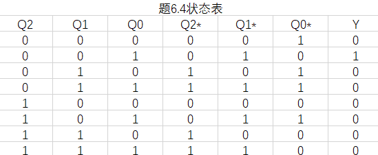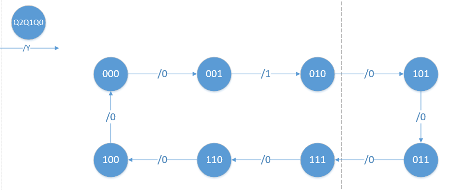 由绘制的状态图可以看出, 电路共有8个有效状态(所有状态均为有效状态)000、001、010、101、011、111、110、100; 当电路状态为001时, 输出Y=1, 其它状态的输出Y=0——这是一个同步八进制计数器.