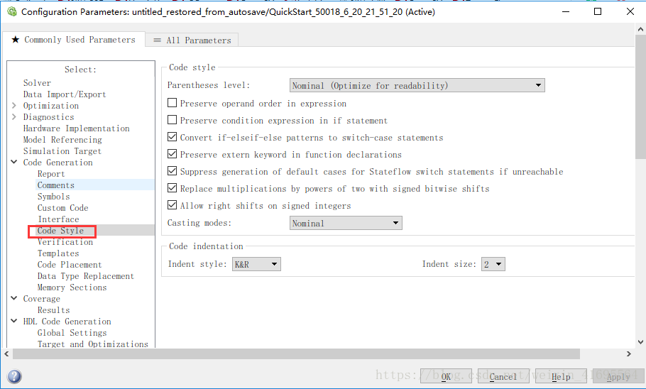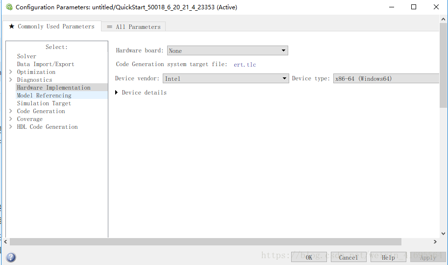按下Ctrl+E打开模型的Configuration Parameter对话框,如下图所示: