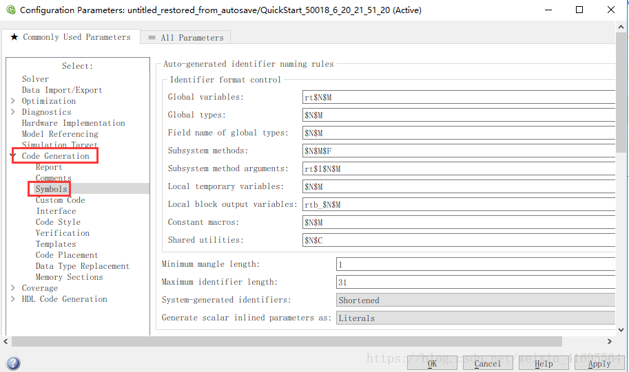 Identifier format control 参数组里默认使用标示符 $R$N$M$T,是Embedded Coder 内部使用的标示符,如下图所示: