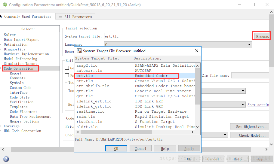 另外一个关键的设置选项是控制整个代码生成过程的系统目标文件System Target File,ert. tlc文件是Embedded Coder提供的能够生成专门用于嵌入式系统C代码的系统目标文件。在Code Generation页面中,单击下图所示右上角Browse按钮可以弹出对话框以选择系统目标文件: