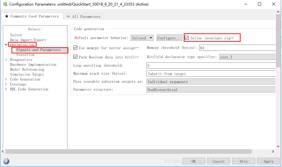 当模型中使用参数变量,如Gain模块的增益值,在生成代码时,如果希望使用该参数的值直接展开到代码中,就需要设置参数内联选项,如下图所示框中选项: