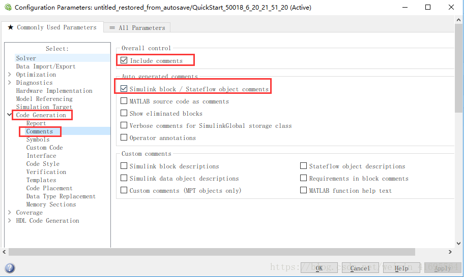 推荐启动 Include comments 选项并勾选 Simulink block Stateflow object comments 选项以生成注释,注释中带有可以从代码跳转到对应模型的超链接,方便追溯模块与代码的对应关系。
