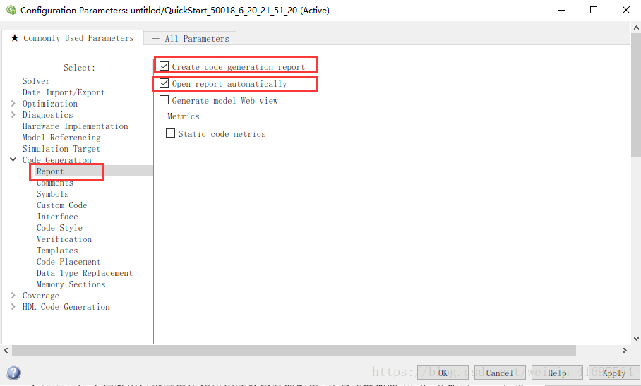 推荐勾选 Create Code Generation Report 及Open report automatically 两个选项,模型生成代码完毕后会自动弹出报告列表,而不需要到文件夹中逐一将源文件手动查找并打开。