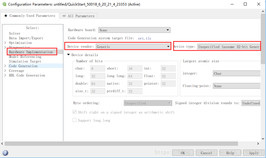Hardware Implenmatation选项是规定目标硬件规格的选项。在这个选项卡中可以配置芯片的厂商和类型,设置芯片的字长、字节顺序等。学习使用通用嵌入式芯片为目标的代码生成流程及原理,选择32位嵌入式处理器作为芯片类型,如下图所示框中部分: