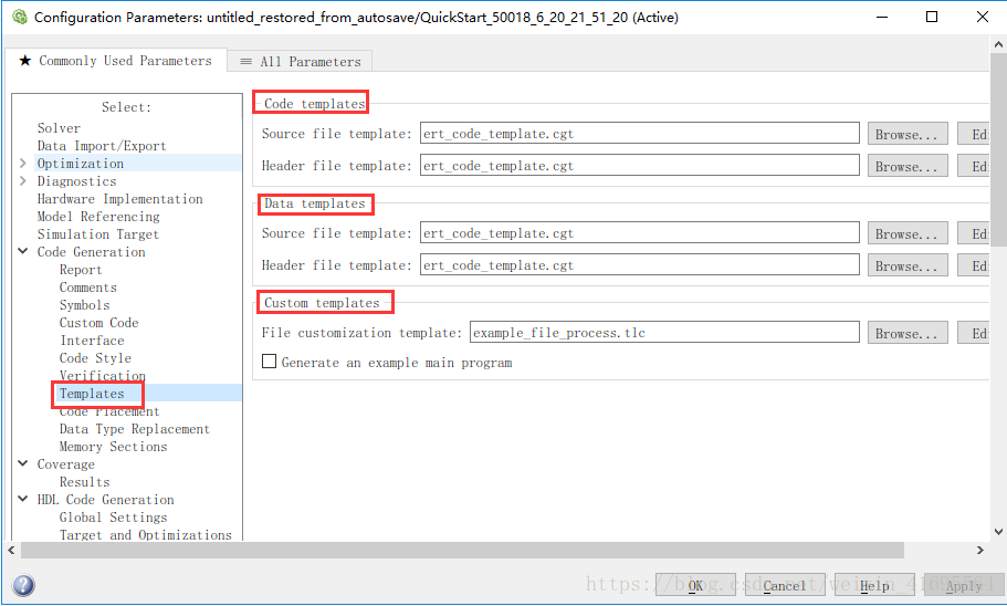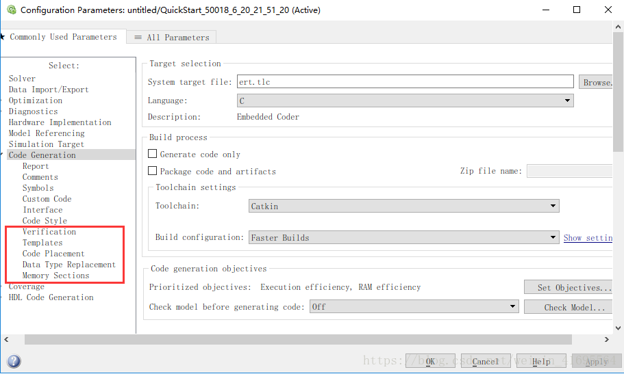 在选择框中选择ert. tlc之后,Code Generation标签页下面的子标签也会发生变化,提供更多的功能选项标签,如下图所示,方框内为新增子标签: