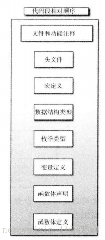 顺序从上到下,依次为:文件 说明的注释(File Banner)、头文件包含(Includes)、宏定义 (Defines)、数据结构类型的定义(Types)和枚举类型的定义(Enum)、各种变量的定义(Definitions),以及函数体的声明(Declarations)和闲数体定义(Functions)。我们可以在相邻的段中插人自定义内容,但是不要打乱既存段的相对顺序。