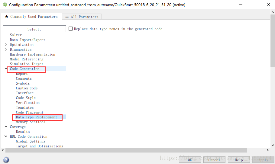 勾选之后则弹出3列数据类型类表,分别是Simulink Name,Code Generation Name 和 Replacement。勾选 Replace data选项之后界面如下图所示: