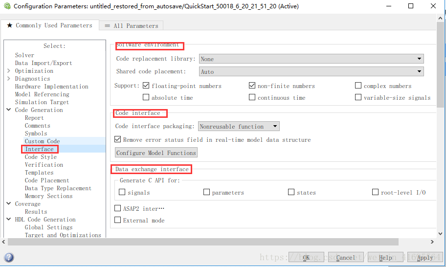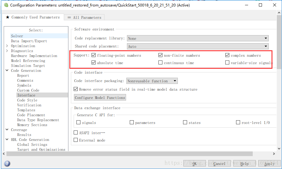 Code Interface与Data Exchange参数组用来配置生成代码的接口及数据记录的方式,如无特殊要求建议使用默认配置。