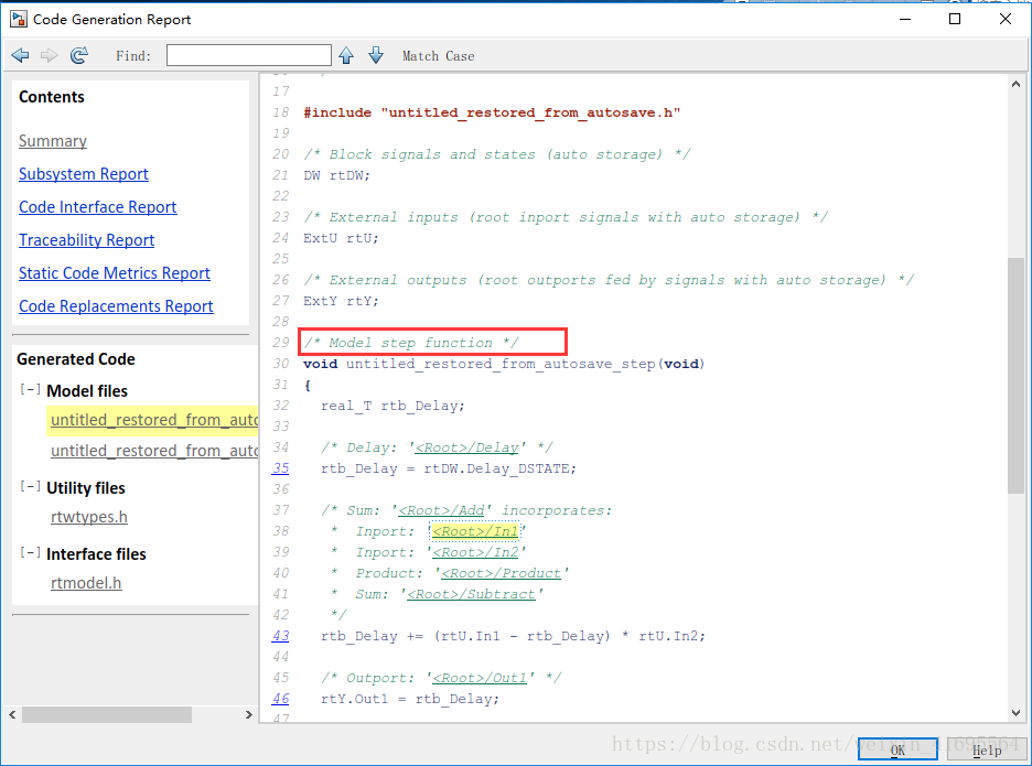 除此之外,生成的代码还提供了 Code to Model追踪功能,单击下图方框中的超链接,可以直接跳转到模型中对应的模块,该模块或子系统将会以蓝色显示。如下所示: