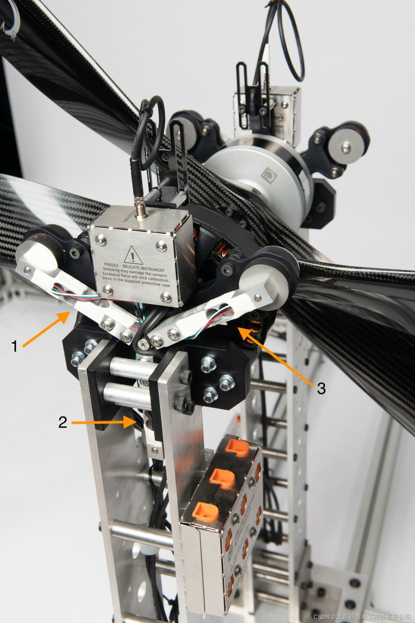 我们的1780系列测试台配备有三个称重传感器,每个传感器支持测量2个方向的拉力,因此系统整体可以测量6个方向的拉力(图2)。下图展示的是我们的一个同轴测试台解决方案,每个无人机推进系统配备了3个称重传感器(2个推进系统共计6个称重传感器)。经过系统校准后,我们即可以精准地测量电机施加到电机安装板上地扭矩和拉力。