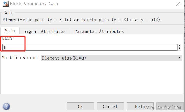 我们怎么设置gain模块的属性,我们只需要双击他,会弹出一个面板。我们看到有三个列,main,signal attributes,parameter attributes。后面两个我们现在暂时不去拓展,后续我们在代码生成的部分会有更加详细的介绍。Main里面可以设置增益的倍速,