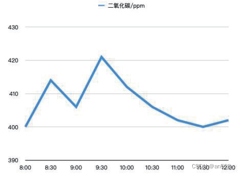 分析上述折线图可得,日温湿度曲线变化从上午八点到十二点是呈上升曲线,一般环境温湿度会随着日出而变化。气压折线图有一个上升曲线,查阅资料得知,一天中,气压有一个最高值、一个最低值,分别出现在9~10 时和15~16 时,还有一个次高值和一个次低值,分别出现在21~22 时和3~4 时。气压日变化幅度较小,一般为0.1~0.4 kPa,并随纬度增高而减小。二氧化碳折线图有小幅度的波动,经分析得出,这样的波动在误差范围内,是由于居家人数变化造成的数据轻微波动,峰值的出现不影响参数总体的测量。