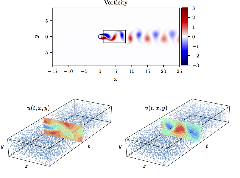 Navier-Stokes 方程: Top: Re=100时,不可压缩流动和动态涡脱落经过圆柱体。时空训练数据对应于圆柱体尾流中所描绘的矩形区域. Bottom: 流向和横向速度分量的训练数据点的位置。.