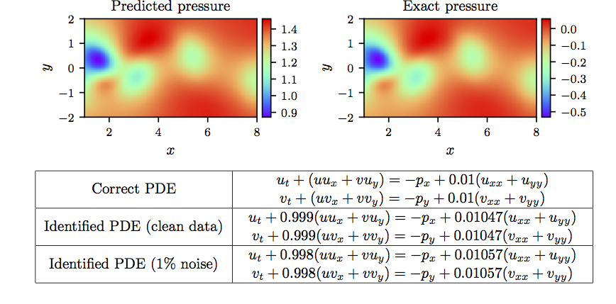 Navier-Stokes 方程: Top: 代表时刻的预测与精确瞬时压力场。根据定义,压力可以恢复到一个常数,从而证明两个图之间的不同幅度是合理的。这种显着的定性一致性突出了基于物理的神经网络在模型训练期间没有使用压力数据而识别整个压力场的能力。Bottom: 对偏微分方程进行了修正.