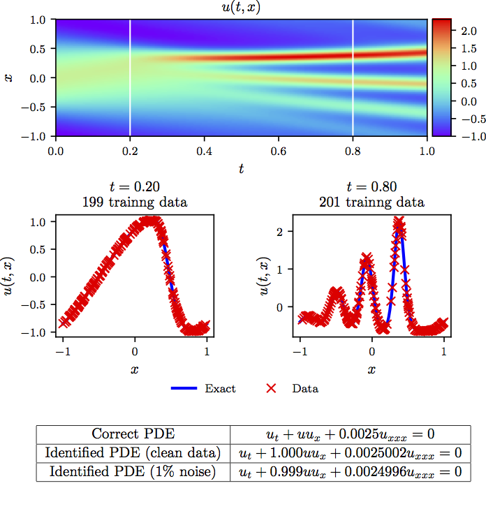 KdV 方程n: Top: 解以及两个训练快照的时间位置. Middle: 上图中虚线所示的两个瞬时快照对应的训练数据和精确解. Bottom: 修正偏微分方程以及确定的方程