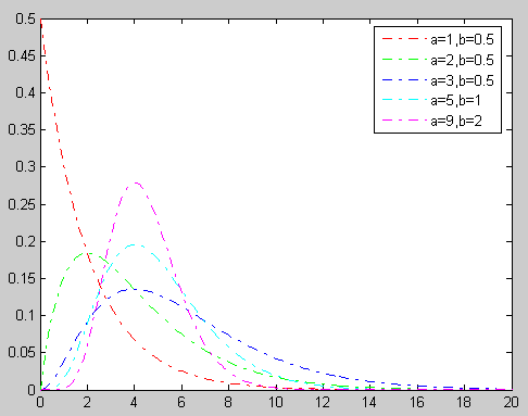 legend(‘a=1,b=0.5’,‘a=2,b=0.5’,‘a=3,b=0.5’,‘a=5,b=1’,‘a=9,b=2’);
