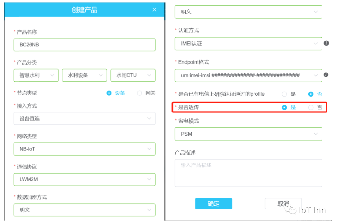 2、在“创建产品”界面,根据自己的需求编辑产品的各项配置(下图仅为举例说明,若第一次创建,建议选择透传模式)。