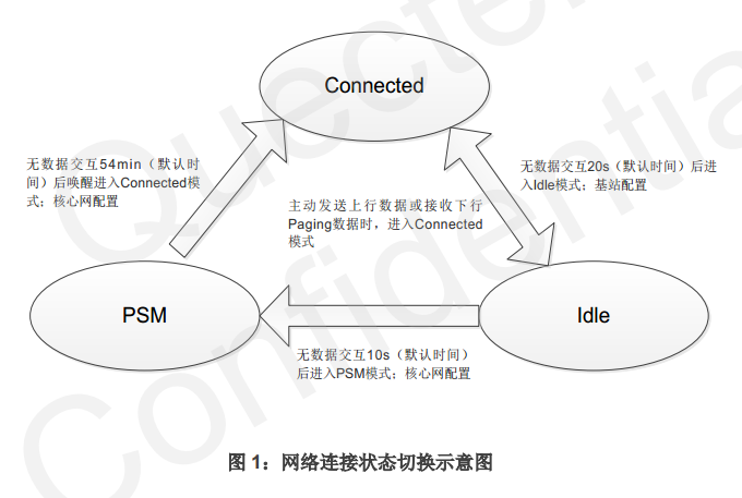 三种连接状态下,均可发送上行数据( CoAP/UDP); IDLE 下发送数据, 模块会进入 CONNECT 状态; PSM 下发送是数据会唤醒模块, 进入 CONNECT,或者当 TAU(TAU 的时长是指从进入 IDLE 开始一直到 PSM 模式结束) 超时,模块唤醒, 进入 CONNECT。