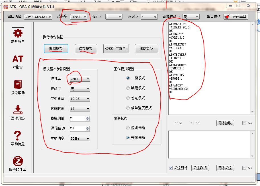 1.两个文档很重要,《ATK-LORA-01无线串口模块用户手册》和《ATK-LORA-01模块配置软件操作说明》,基本通过这两个文档就可以掌握lora模块的大致使用,原子的配置lora模块的软件:ATK-LOAR-01配置软件,配置lora时,顶层的波特率应设置为115200,把MD0口置高,配置完成以后得先把MD0端口置低或者xu该软悬空,否则配置的参数在下次上电后会恢复默认配置;该软件不仅可以配置lora模块的各种参数和模式,还能作为串口调试助手使用,用来接收和发送数据,接收数据时,把顶层的串口参数设置成发送模块的波特率一样即可,例如设置发送和接收模块的时设置波特率为9600,则接收模块在连接到该配置软件时,模块的MD0拉低或悬空即可,然后把顶层的波特率设置为115200,,。。,如下图: