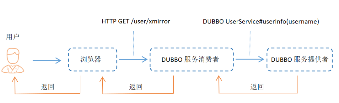 其链路跟踪的过程原理可总结为:用户在浏览器操作web页面时发出HTTP请求并由网络传输到后端服务,后端服务在内部处理请求时,由Dubbo服务消费者调用服务提供者,触发一次Dubbo RPC回调,再逐层返回给用户层。基于IAST探针覆盖度及可对函数进行跟踪的特性,可在请求接收操作过程中,由Dubbo服务提供的信息向上溯源,找到触发本次Dubbo调漏洞的源头调信息,如:HTTP GET/user/xmirror,从而溯源绘制调用链路路径。