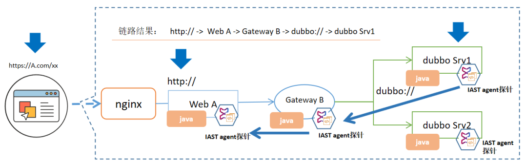 云原生架构下,应用微服务化,同一个微服务应用被独立出来,可以被多个上游微服务进行调用。微服务间通过REST API或RPC API互相调用,错综复杂。微服务化降低了软件的耦合度,为应用开发发布提供了便利,但同样也增加了风险暴露面和漏洞溯源难度。IAST利用其应用插桩特性,实现微服务调用链路跟踪,展示微服务应用漏洞攻击链路,解决风险所在具体应用进程的追溯问题。这里以Dubbo框架微服务为例: