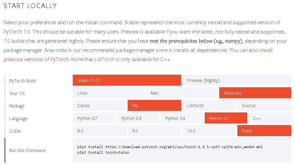 刚开始在pycharm里面装,无法安装,各种解决不了,按照网上说的添加数据源,改配置都不行,最后上官网https://pytorch.org,发现其实安装很简单