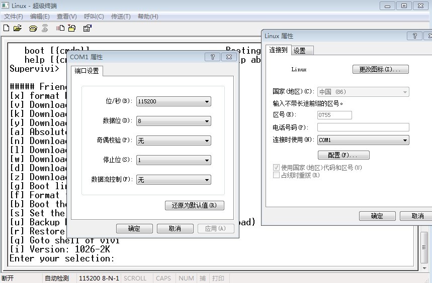3.超级终端设置里面要把com端口属性里的数据流控制设置成:无,然后连接相应的com端口